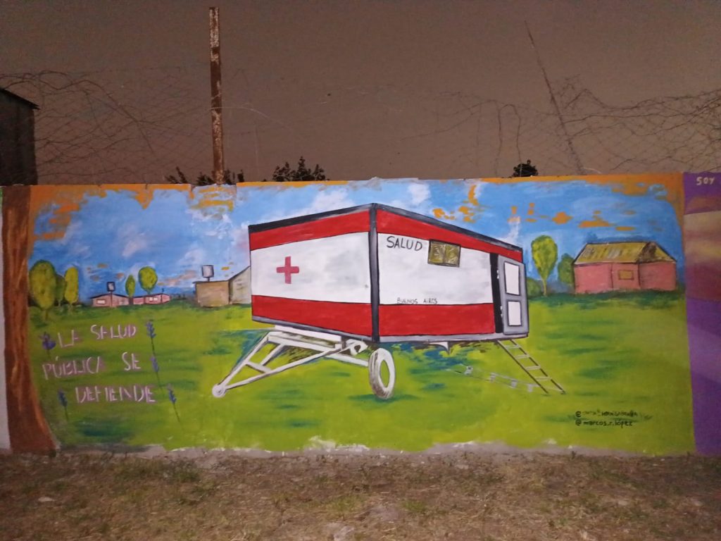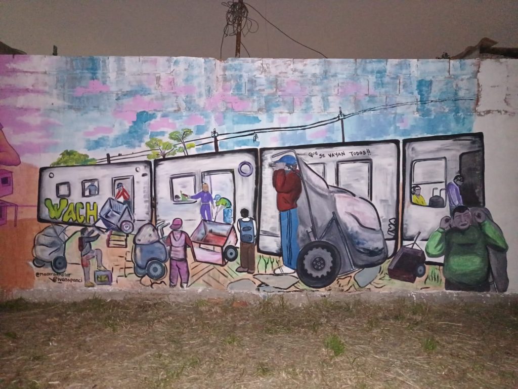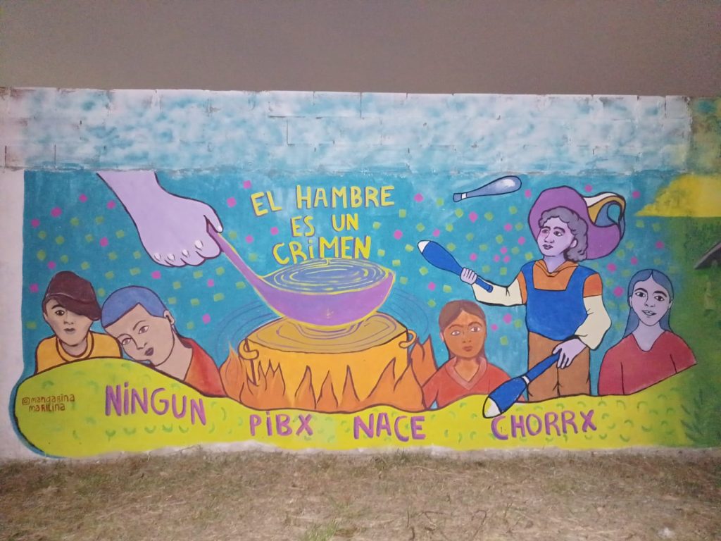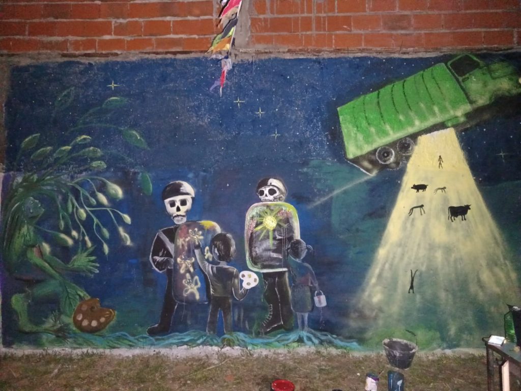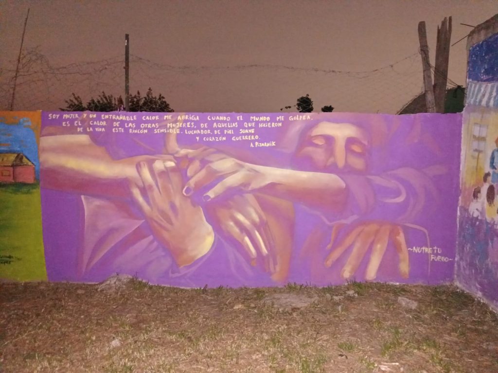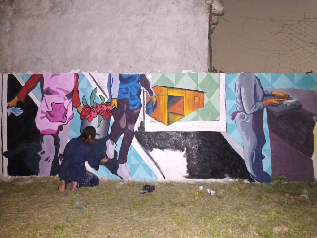 «Desde el espacio de sendero de la memoria y nos dio una mano enorme Anahi Rojas de la biblioteca popular Paulo Freire y también hubo otras y otros moralistas, también fue un boca en boca que terminó con la participación de 28 muralistas (…) arrancamos muy temprano y terminamos alumbrando con la luz de los celulares».