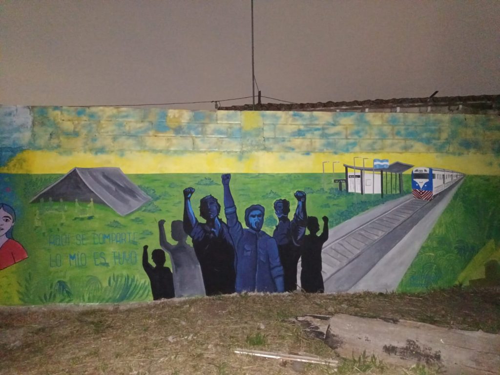 La línea de tiempo recorre, en murales, la historia del barrio: de los pueblos originarios, el pasaje por el lugar de las tropas del general San Martín, el castillo de los Anchorena, la dictadura, la vuelta a la democracia, el surgimiento de las organizaciones sociales y comunitarias, las ollas populares, el tren blanco y cierra en el 2018 con el abrazo a las escuelas.